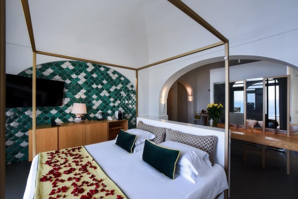 Experience a unique sensory experience in our Executive Suite. The panoramic view of the sea and the village of Positano, the private sauna, the indoor Jacuzzi and the elegant furnishings create a relaxing and revitalising atmosphere. The spacious sleeping area and open-plan bathroom with an exposed shower offer maximum comfort.