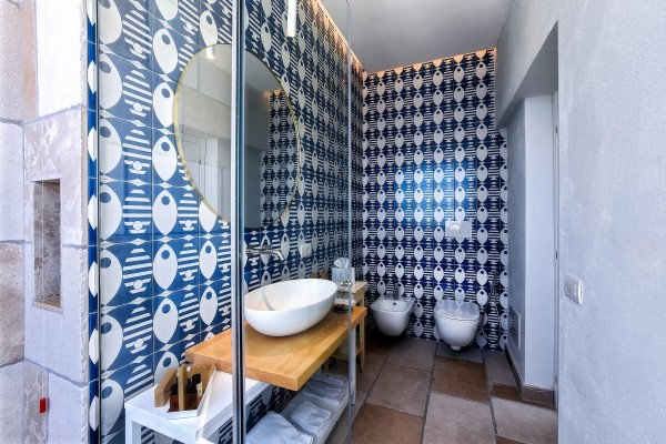 L'ambiente è caratterizzato da linee pulite e materiali naturali, mentre il bagno, integrato nella camera, con doccia a vista, aggiunge un tocco di contemporaneità.