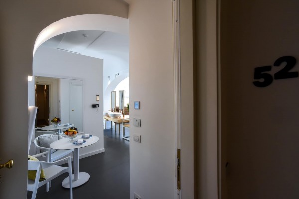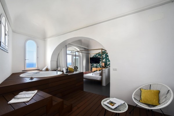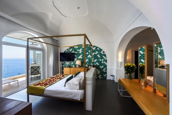Vivi un'esperienza sensoriale unica nella nostra Executive Suite. La vista panoramica sul mare e sul paese di Positano, la sauna privata, la vasca idromassaggio interna e l'arredamento elegante creano un'atmosfera rilassante e rigenerante. L'ampia zona notte e il bagno open-space con doccia a vista offrono il massimo comfort.