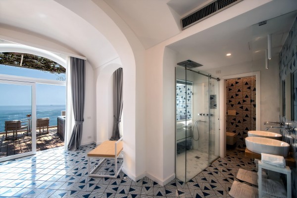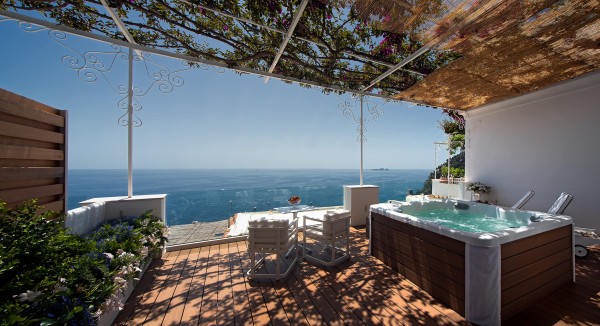 The private terrace, with a panoramic view of the sea, is the ideal place to relax in the romantic Jacuzzi, surrounded by a flowery pergola.