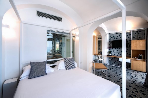 The large open-plan space, characterised by clean lines and fine materials, is embellished with Vietri majolica tiles that recall the local tradition. The bathroom, integrated into the room, has a large exposed shower.