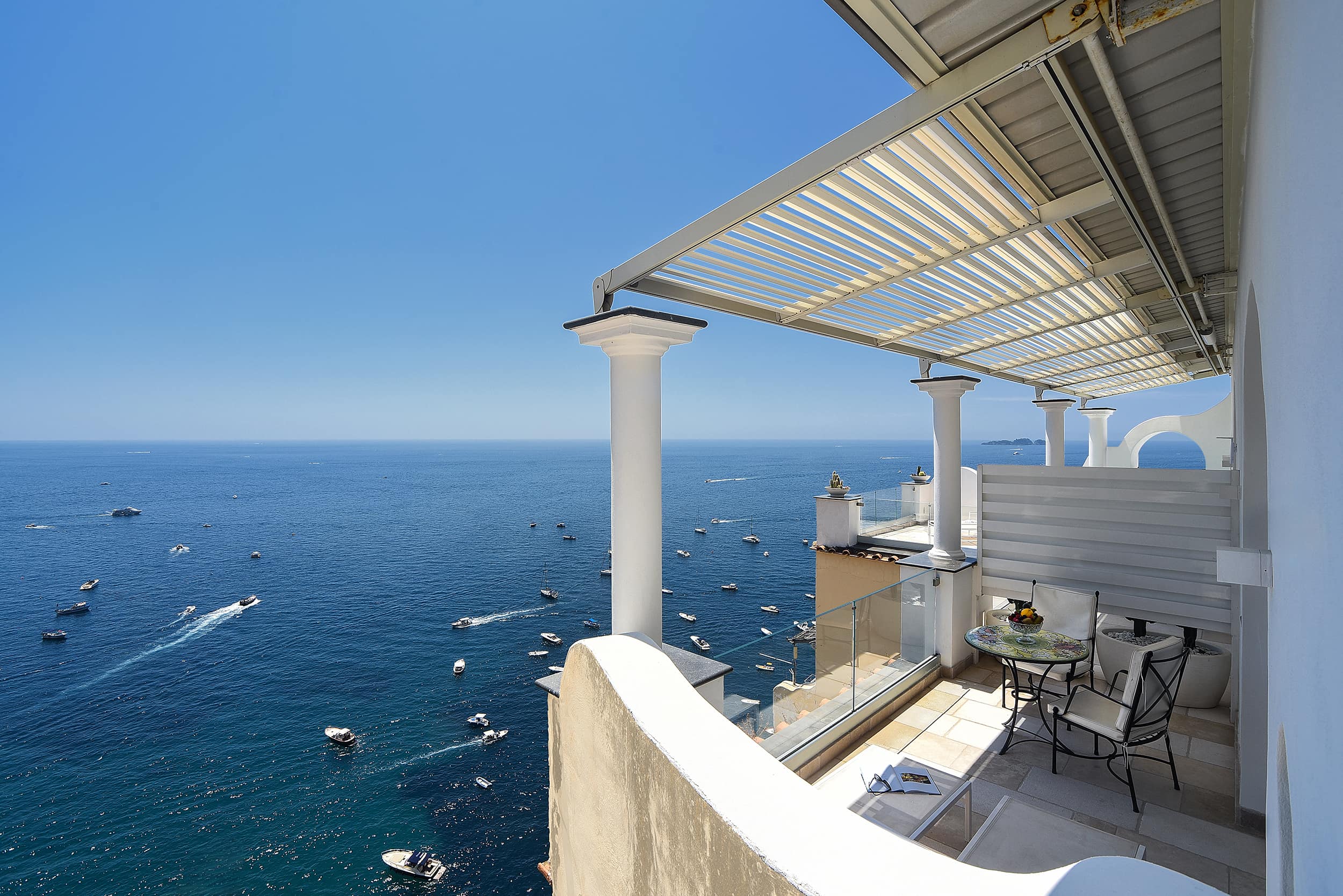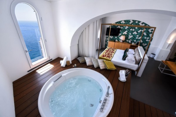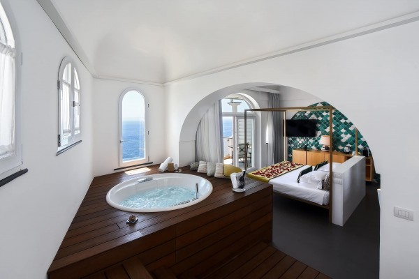 Vivi un'esperienza sensoriale unica nella nostra Executive Suite. La vista panoramica sul mare e sul paese di Positano, la sauna privata, la vasca idromassaggio interna e l'arredamento elegante creano un'atmosfera rilassante e rigenerante. L'ampia zona notte e il bagno open-space con doccia a vista offrono il massimo comfort.