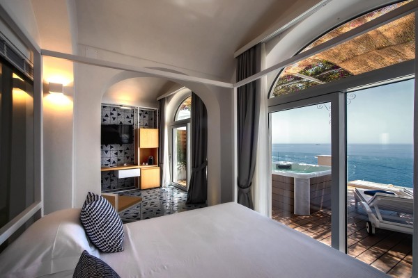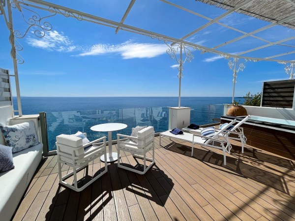 La terrazza privata, con vista panoramica sul mare, è il luogo ideale per rilassarsi nella romantica vasca idromassaggio, circondata da un pergolato fiorito.
